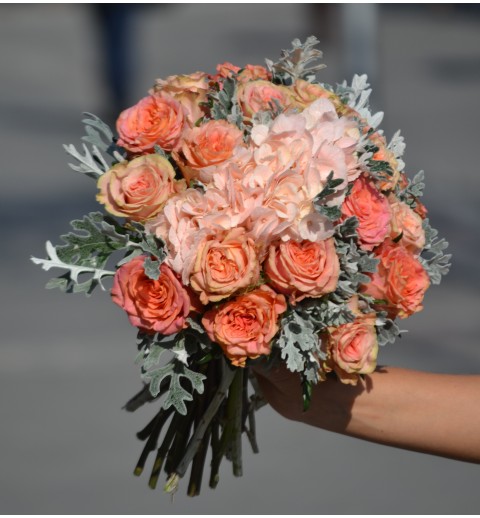 Jedinečná svadobná kytička v jesennom a zimnom období. Farbu a počet ruží, hortenzií a dálií si môžte vybrať. Informujte sa na 0948 772273. Radi Vám pripravíme aj kytičky pre družičky a svadobné mamy.